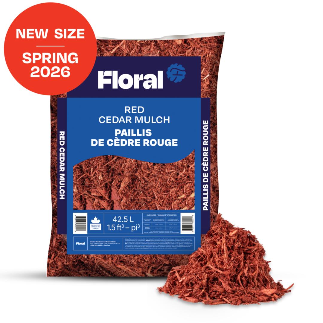 Bonne nouvelle pour les amateurs de jardinage ! Dès le printemps 2026, les paillis Floral seront offerts dans un tout nouveau format pratique de 1,5 pied cube. Plus léger, plus maniable et facile à transporter, ce nouveau format simplifie tous les travaux de jardinage autour de la maison. Retrouvez la même qualité supérieure et les couleurs riches qui font la réputation des paillis Floral, bientôt dans un format… juste parfait! Le paillis de cèdre rouge est une décoration de sol totalement organique et de belle apparence, aromatique, nutritive, économique et facile d’utilisation. Il est fabriqué à 100 % de produits naturels issus de la forêt. Ce couvre-sol décoratif réutilisable convient autant pour les aménagements commerciaux que résidentiels. Il peut être placé aux pieds des arbres, des arbustes, des jeunes haies, des plates-bandes, dans le potager, autour du patio et de la piscine ou sur la surface des sentiers. Le paillis de cèdre est plus durable que les paillis d’écales de cacao ou de feuilles mortes déchiquetées, qui sont des paillis à décomposition rapide.